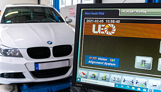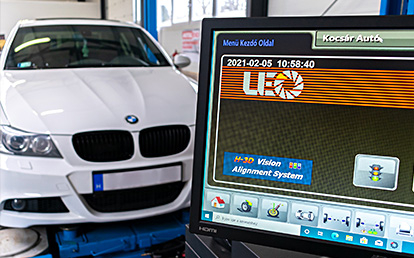 Futómű diagnosztika: Lengéscsillapítók, kerékösszetartás és centírozás ellenőrzése.